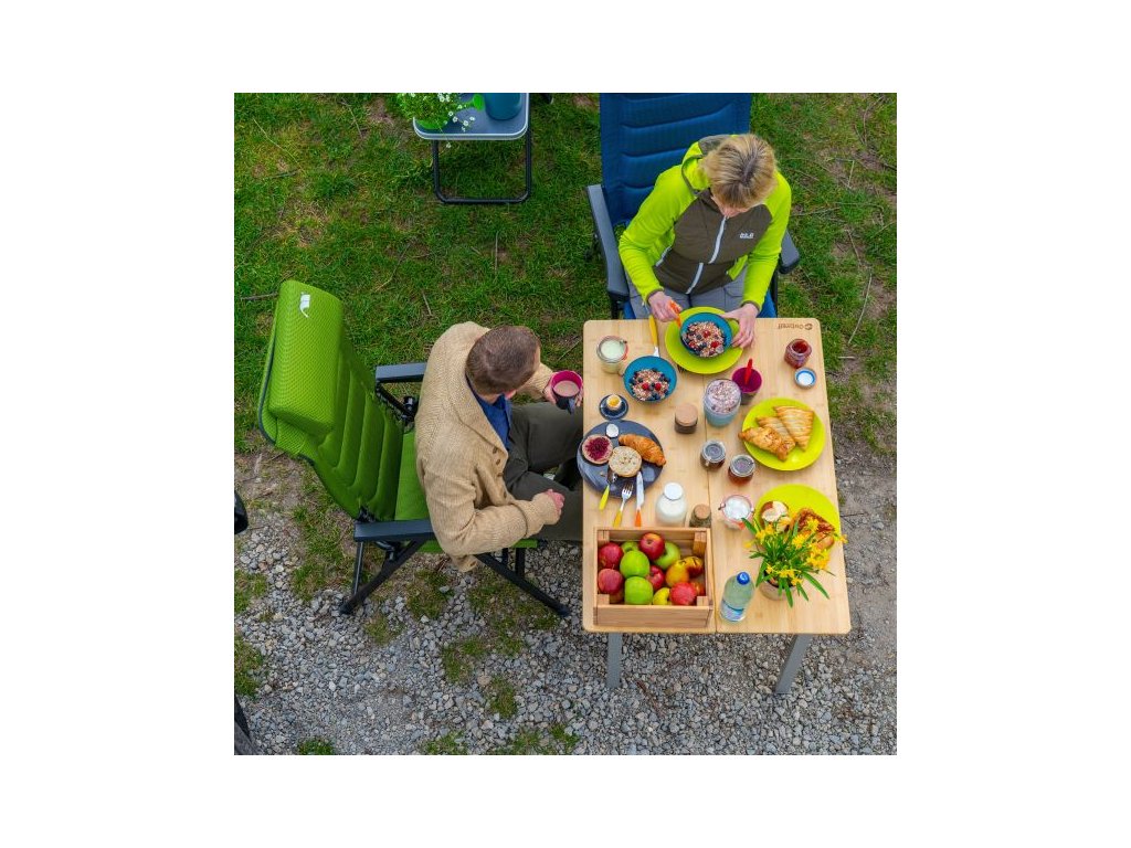Stylový stůl s moderním designem. Vyrobeno z odolných materiálů, má odolnou bambusovou desku stolu a hliníkový rám. Montáž a demontáž během několika sekund. Praktická madla umožňují snadnou přepravu. Malá velikost balení. Nastavitelné nožičky.