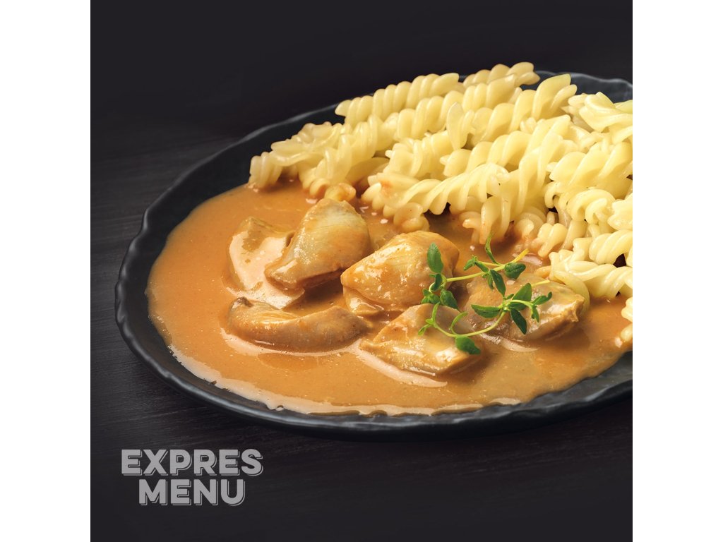 Šťavnaté kousky masa z kuřecích stehen, dušené do měkka v omáčce na cibulovém základu se sladkou paprikou a smetanou. Přílohou jsou fusilli z rýžové mouky.