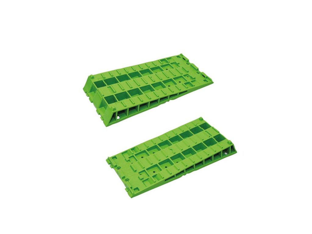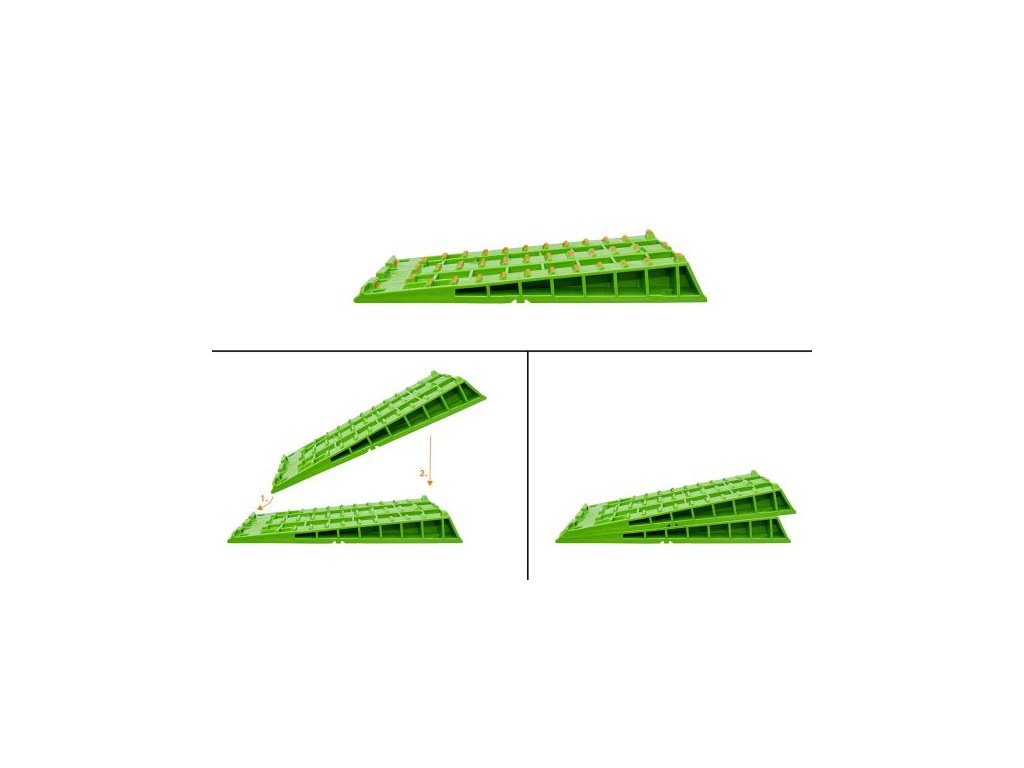 Stohovatelný kompaktní klín pro snadné, plynulé najíždění a dokonalé nastavení výšky. Vysoká stohovatelnost, protože lze stohovat až 3 kompaktní klíny na sebe, díky 38 uzamykacím bodům. Klíny vyrobené z 95 % plastu na biologické bázi (PE, z obnovitelných surovin, jako je cukrová třtina), takže se do značné míry vyhýbají konečným surovinám na bázi ropy.