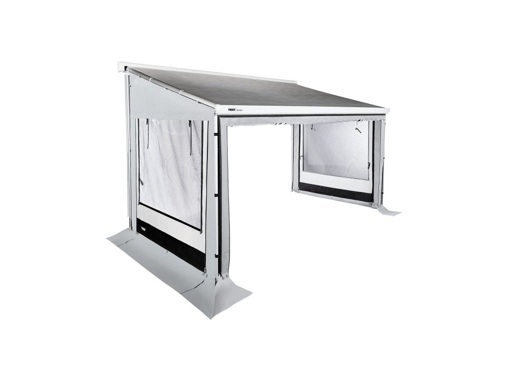 Osvědčený ochranný stan Safari Residence se skládá ze 2 samostatných bočních stěn v neutrální barvě (RAL 9002). Okenní fólie zabudované do bočních panelů jsou vybaveny moskytiérami a lze je zcela otevřít. Přední část má integrované vstupní dveře vpravo i vlevo (od délky 3,5 m) a lze je částečně nebo zcela srolovat. Díky integrované potrubní liště lze čelo snadno kupř. B. lze kombinovat s opalovacím krémem. Boční stěny jsou pevně spojeny s látkou markýzy pomocí upínacího profilu. Čelo a boky jsou vzájemně spojeny dvojitým potrubním profilem, čímž vzniká silné, větruodolné spojení. Výškově stavitelný profil stožáru s dvojitým pryžovým břitem, do kterého je zasunuto potrubí boční stěny, je přitlačen ke stěně vozidla a dokonale tak utěsní tuto oblast. Diagonální podpěra mezi upínacím profilem a profilem stožáru poskytuje dodatečnou stabilitu. Thule Residence G3 je k dispozici v 6 různých výškách (viz tabulka) pro vozidla s rovnými bočními stěnami. V případě markýzy typů 5003, 5200 a 8000 namontované těsně nad dveřmi vozidla jsou na zvláštní objednávku k dispozici speciální boční stěny ve výškách M a L pro kombinaci s vyšším čelem s nižším sklonem střechy. Boční díly jsou dodávány včetně 2 brašen a přední díl je dodáván včetně autozástěry.