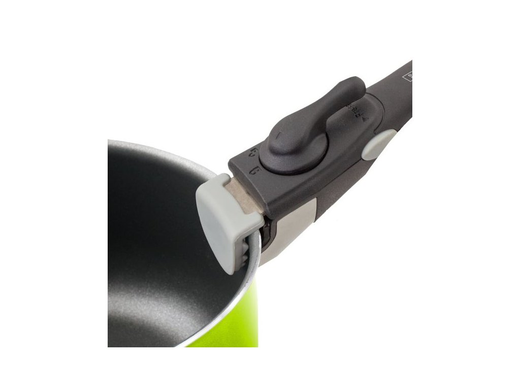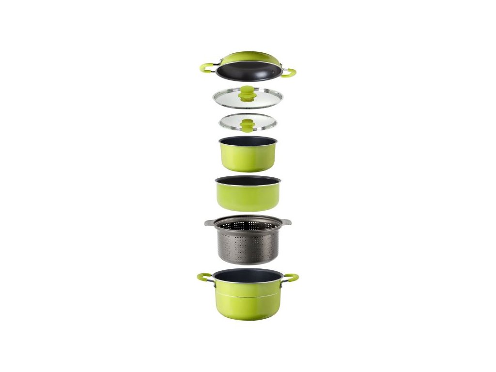 Hliníková sada hrnců s poklicí z nerezové oceli a měkkými rukojeťmi. S nepřilnavým povlakem. Vhodné pro plynové, elektrické, halogenové a sklokeramické varné desky.