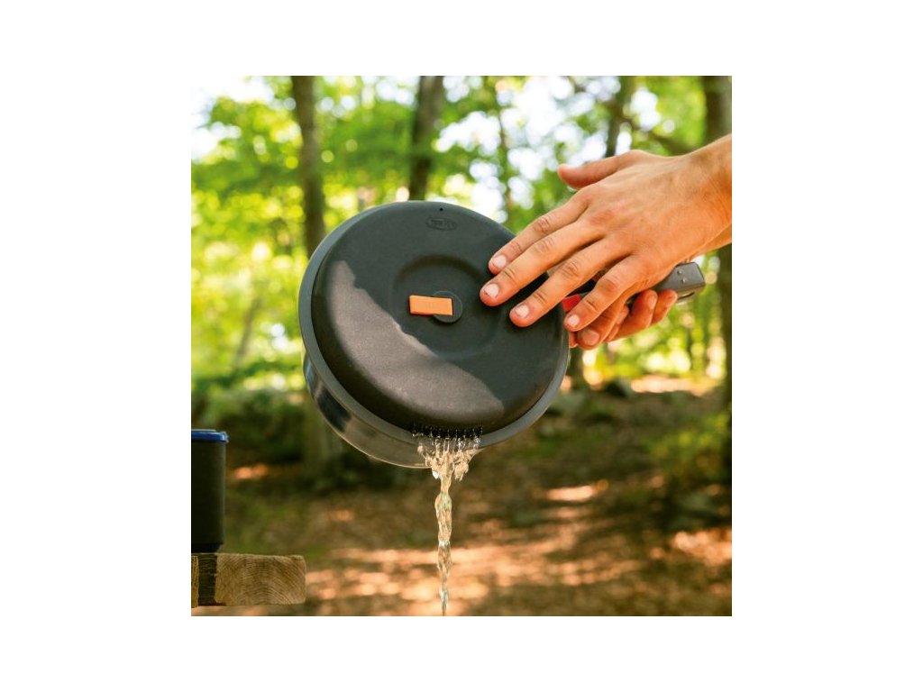 Výkonný keramický nepřilnavý povrch pro snadné vaření a čištění. Patentovaná skládací rukojeť, která se uzamkne na vnějších konzolách, aby se zabránilo poškrábání a poskytla bezpečné uchopení při vaření. Nerozbitné, žáruvzdorné víko sítka. Robustní obal na sadu.